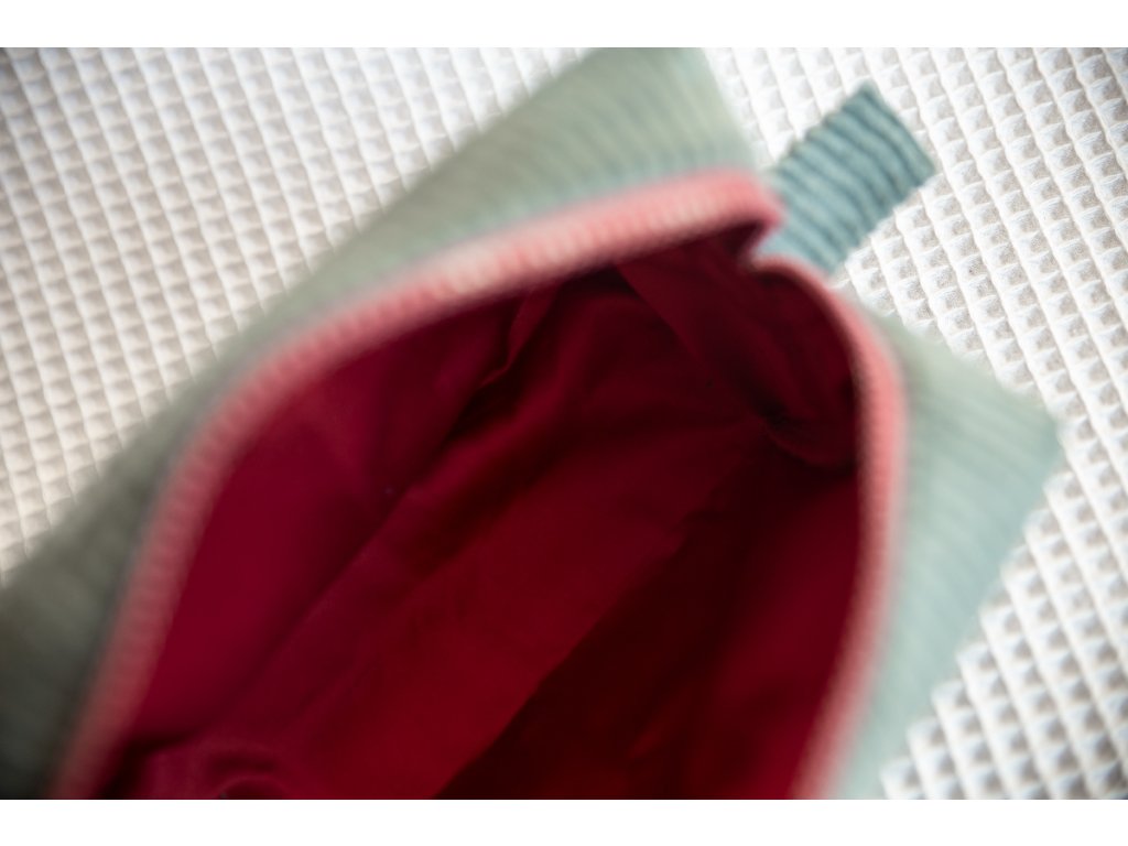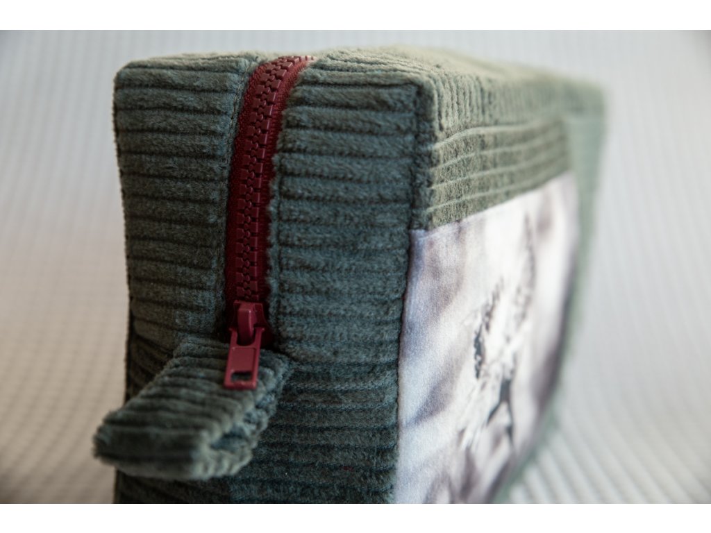 Je ručně šitá z kvalitního manšestru s plyšovou černobílou fotografií a s lesklým saténovým vnitřkem. Jedna velká kapsa se zipem se postará o přehlednost a rychlý přístup ke všem vašim věcem.