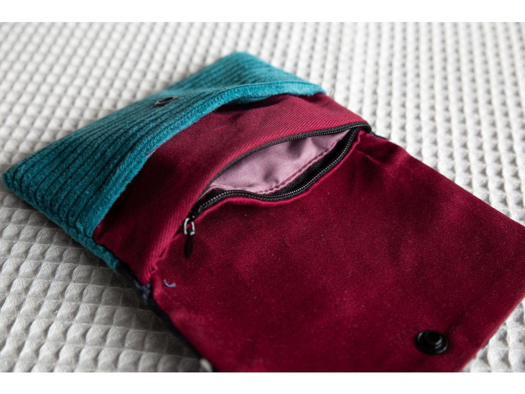 Ledvinka má jednu základní kapsu zavíratelnou na zip. Je ušita z vnější strany z manšestru a plyšové látky s potiskem autorské fotografie a uvnitř se skrývá bavlněná látka s pevnou keprovou vazbou. Bavlněný popruh o šířce 3cm je nastavitelný a doplněný o kovové prvky s karabinou.