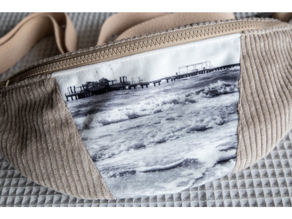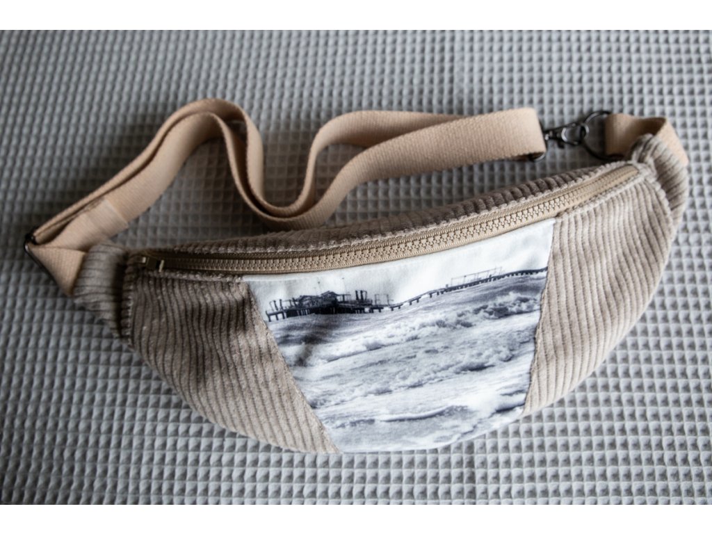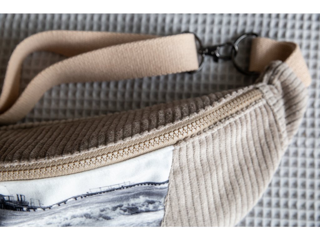 Crossbody ledvinka z manšestru s autorskou fotografií na plyši. Ruce máš volné, všechno důležité na dosah.
