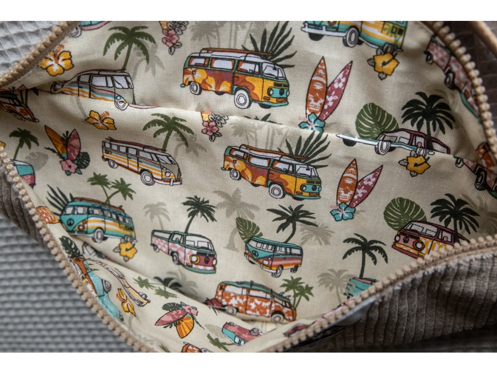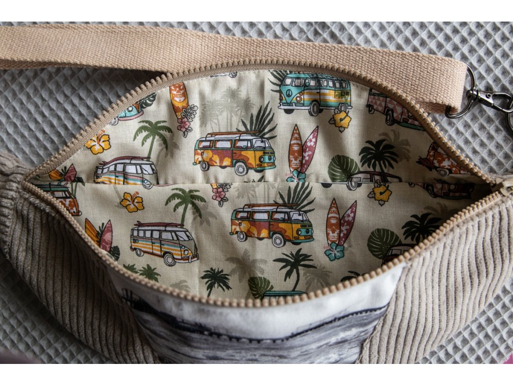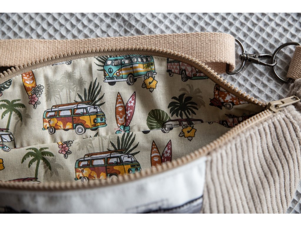 Kombinace měkkého manšestru, plyše s fotografií a pevné bavlněné podšívky uvnitř. Kvalitní zip, nastavitelný bavlněný popruh o šířce 3 cm s kovovými prvky a karabinou.