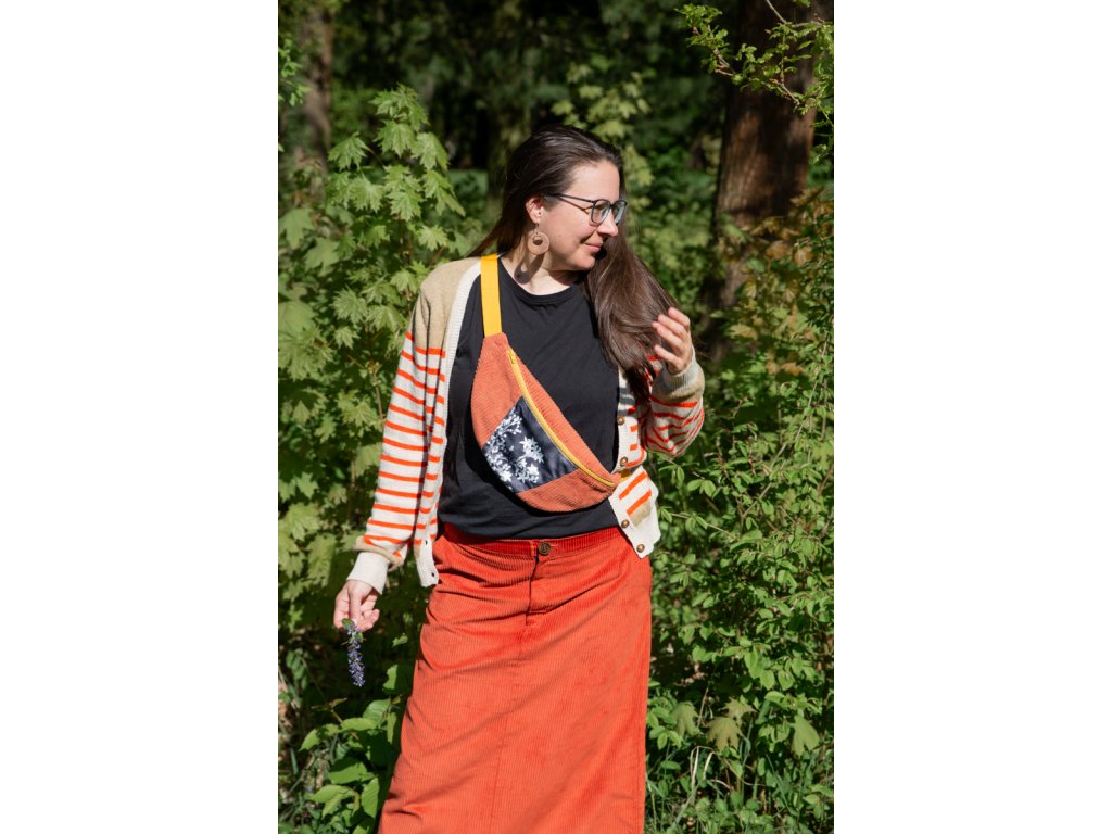 Crossbody ledvinka z manšestru s autorskou fotografií na plyši. Ruce máš volné, všechno důležité na dosah.