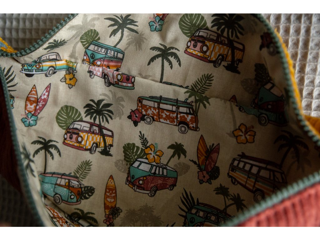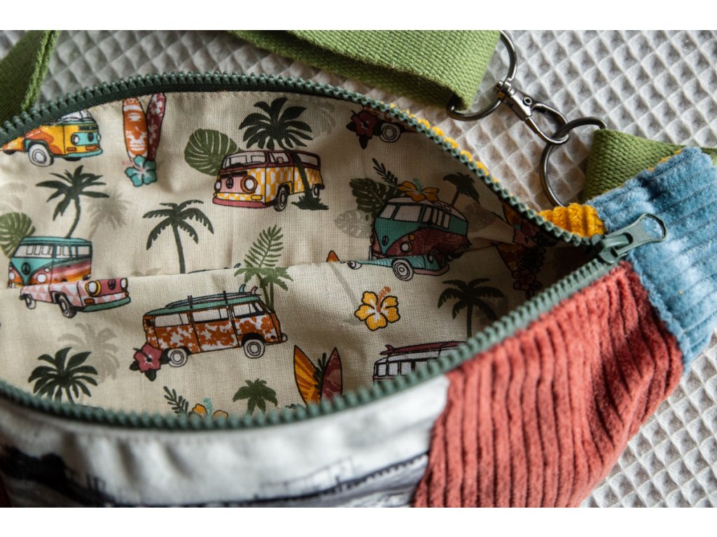 Ledvinka má jednu základní kapsu zavíratelnou na zip. Je ušita z vnější strany z manšestru a plyšové látky s potiskem autorské fotografie a uvnitř se skrývá pevná bavlněná látka s keprovou vazbou. Bavlněný popruh o šířce 3cm je nastavitelný a doplněný o kovové prvky s karabinou.