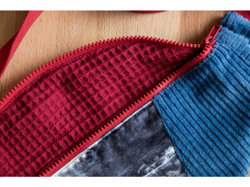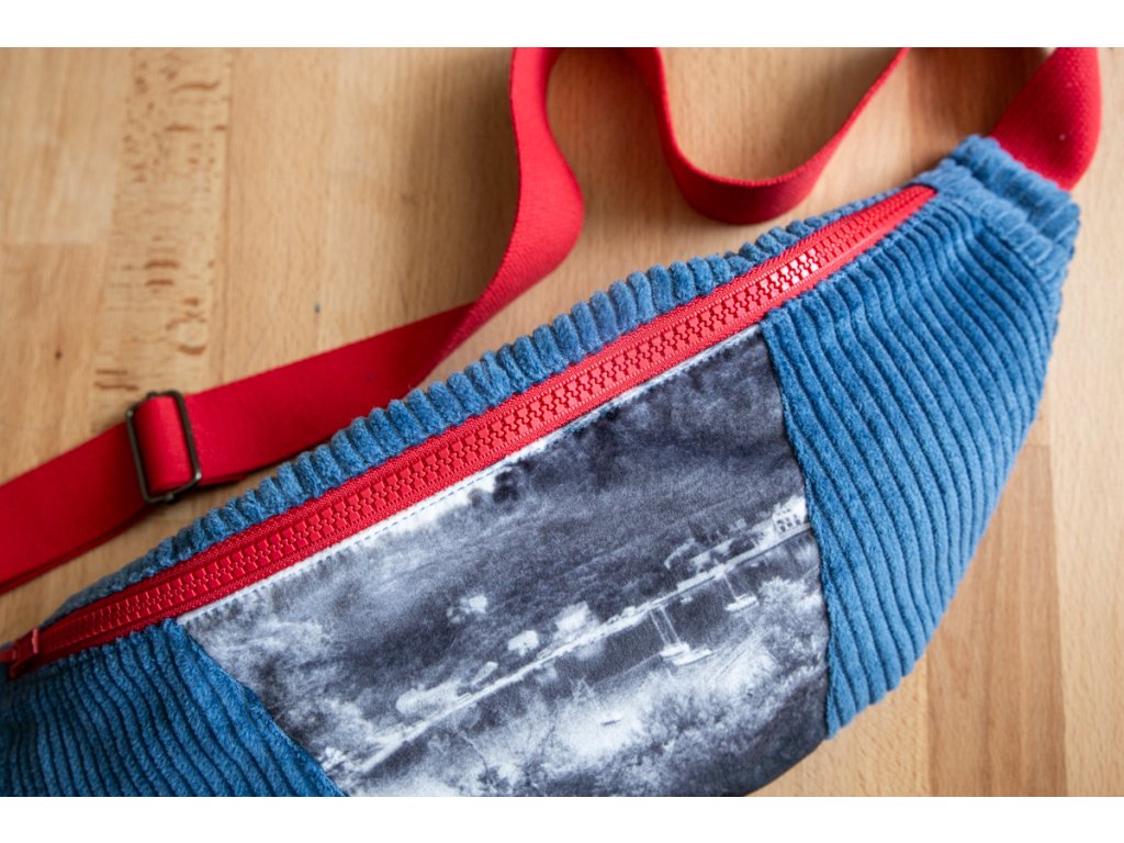 Crossbody ledvinka z manšestru s autorskou fotografií na plyši. Ruce máš volné, všechno důležité na dosah.