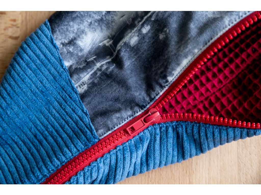 Kombinace měkkého manšestru, plyše s fotografií a pevné bavlněné podšívky uvnitř. Kvalitní zip, nastavitelný bavlněný popruh o šířce 3 cm s kovovými prvky a karabinou.
