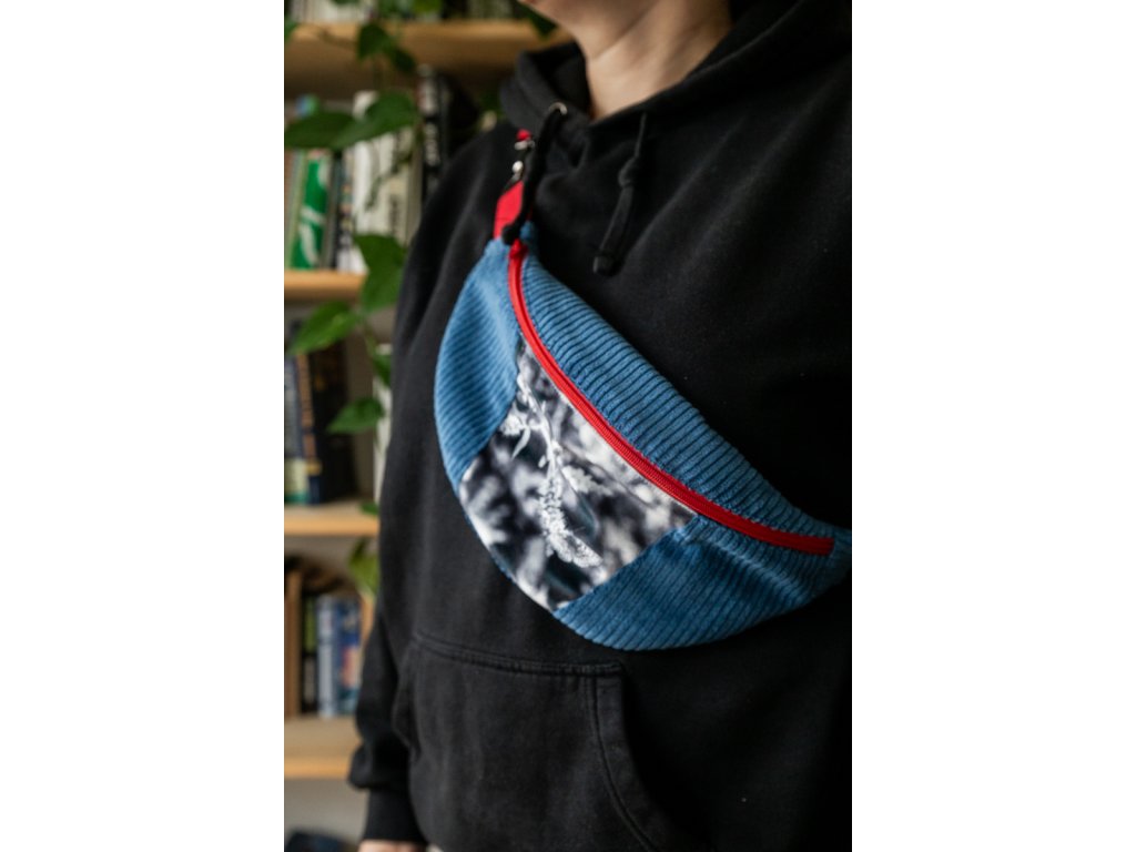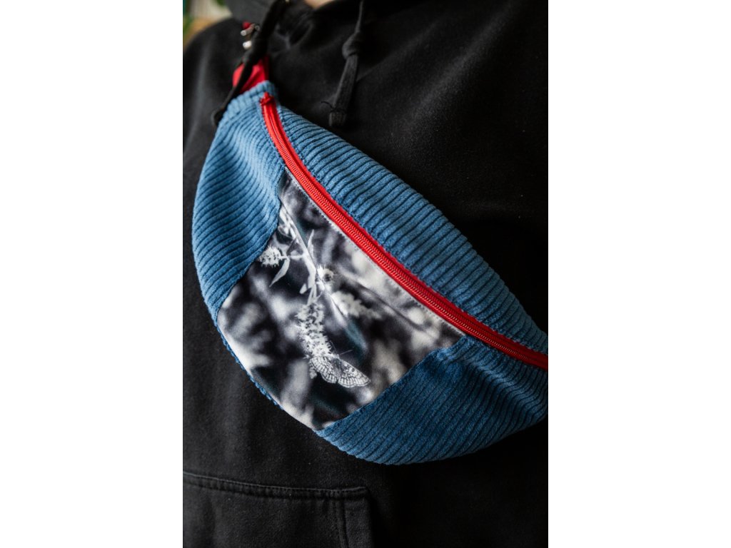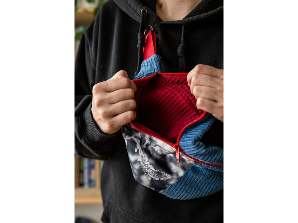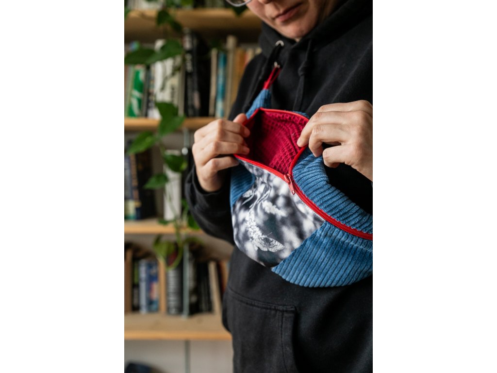 Crossbody ledvinka z manšestru s autorskou fotografií na plyši. Ruce máš volné, všechno důležité na dosah.