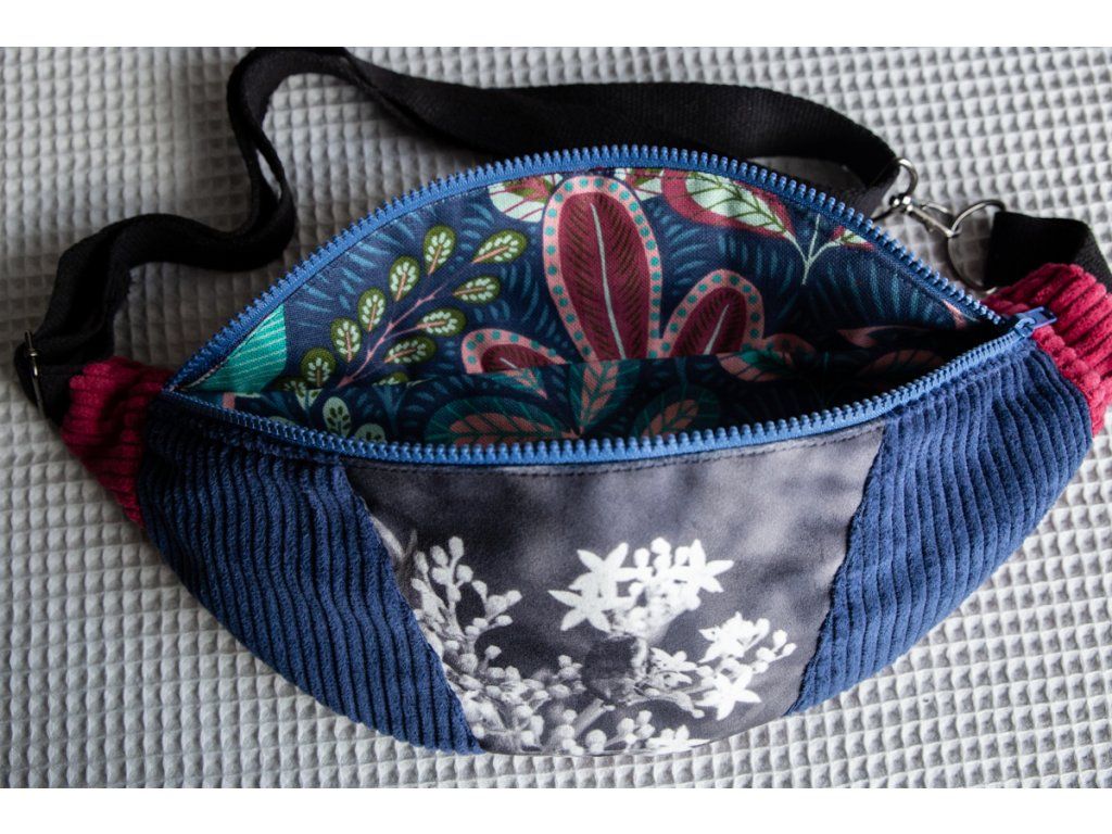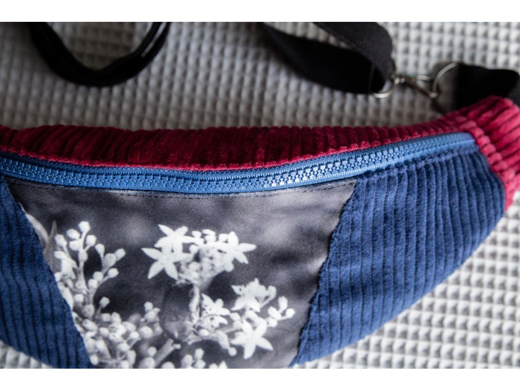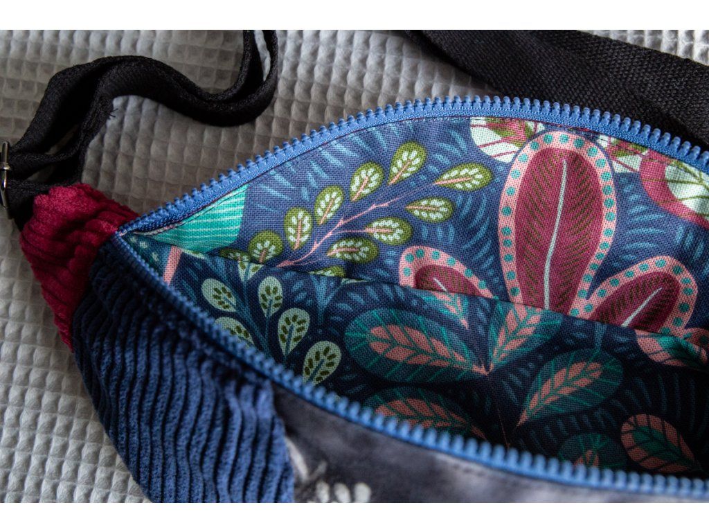Ledvinka má jednu základní kapsu zavíratelnou na zip. Je ušita z vnější strany z manšestru a plyšové látky s potiskem autorské fotografie a uvnitř se skrývá bavlněná látka s potiskem. Bavlněný popruh o šířce 3cm je nastavitelný a doplněný o kovové prvky s karabinou.