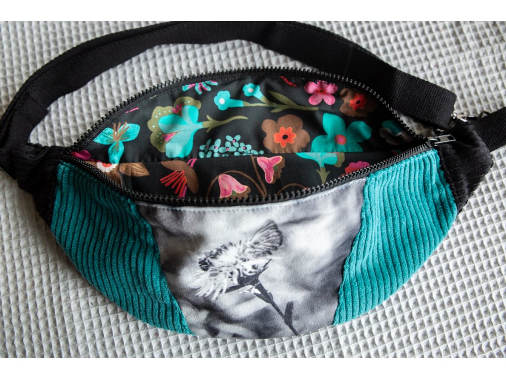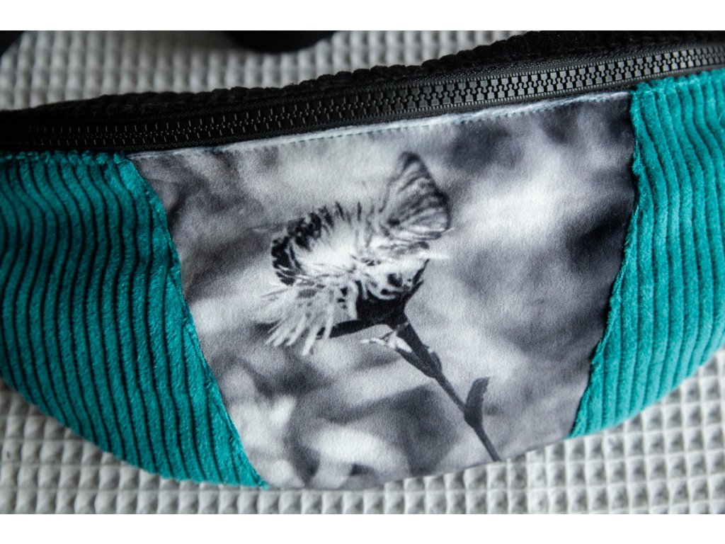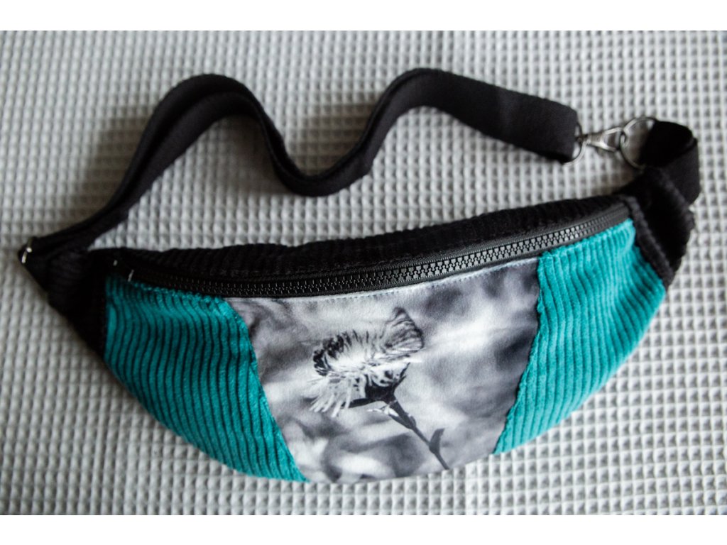 Crossbody ledvinka z manšestru s autorskou fotografií na plyši. Ruce máš volné, všechno důležité na dosah.