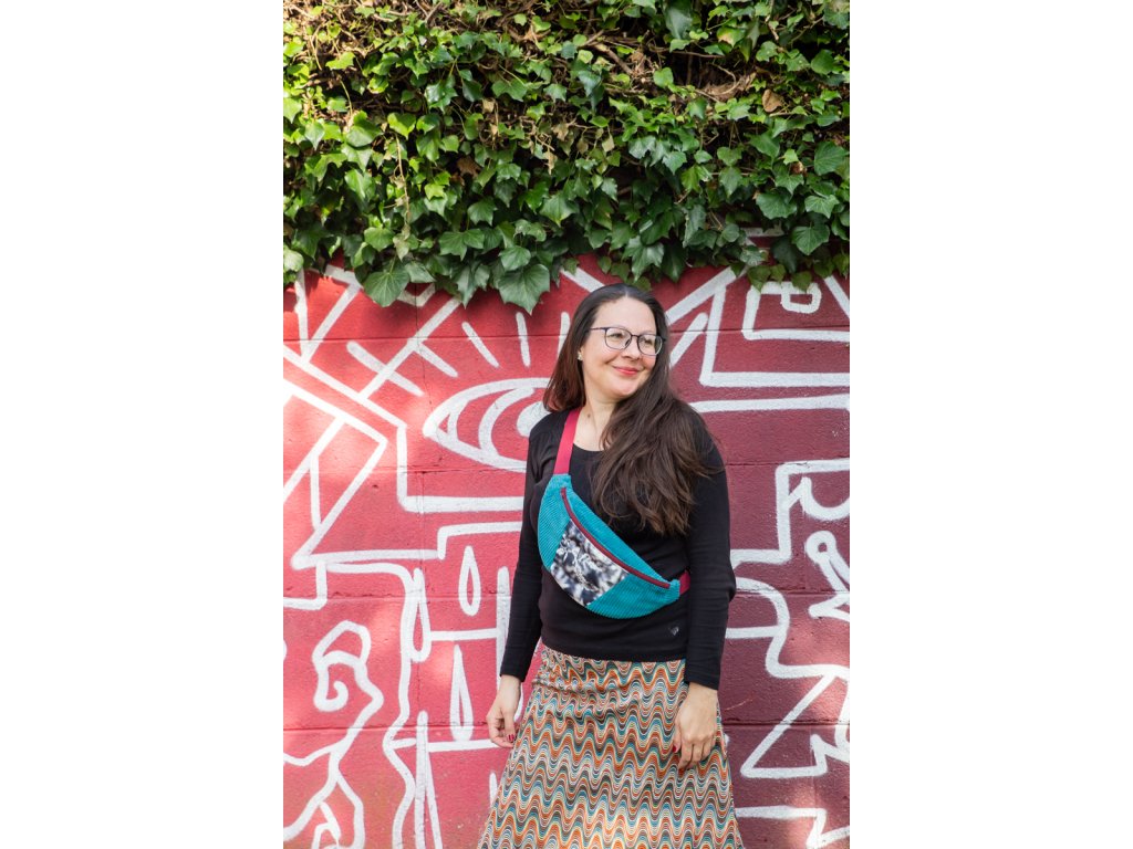 Crossbody ledvinka z manšestru s autorskou fotografií na plyši. Ruce máš volné, všechno důležité na dosah.