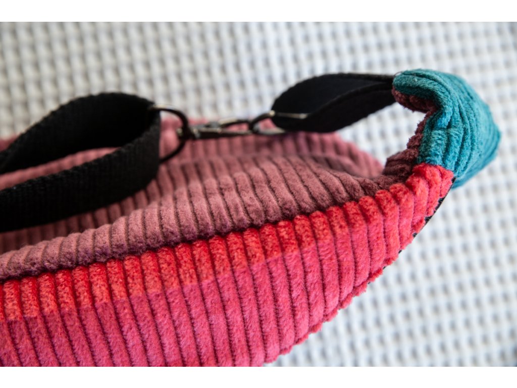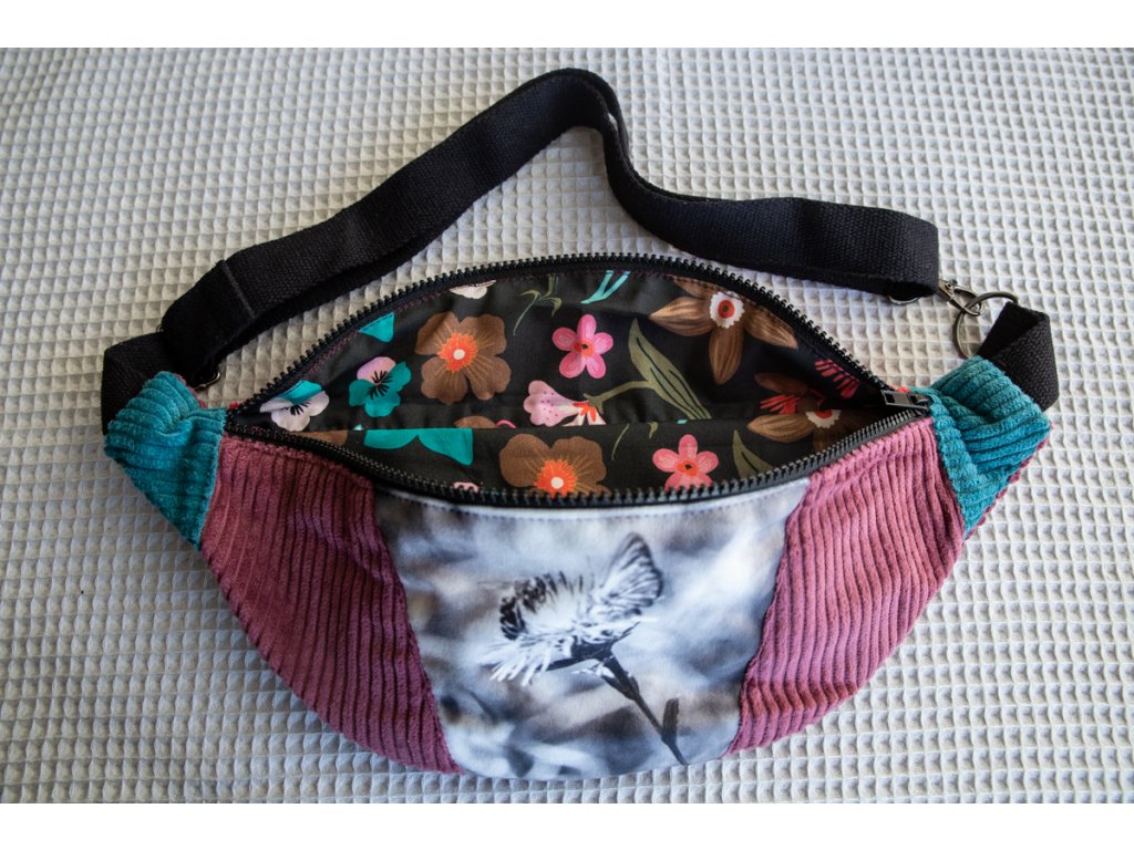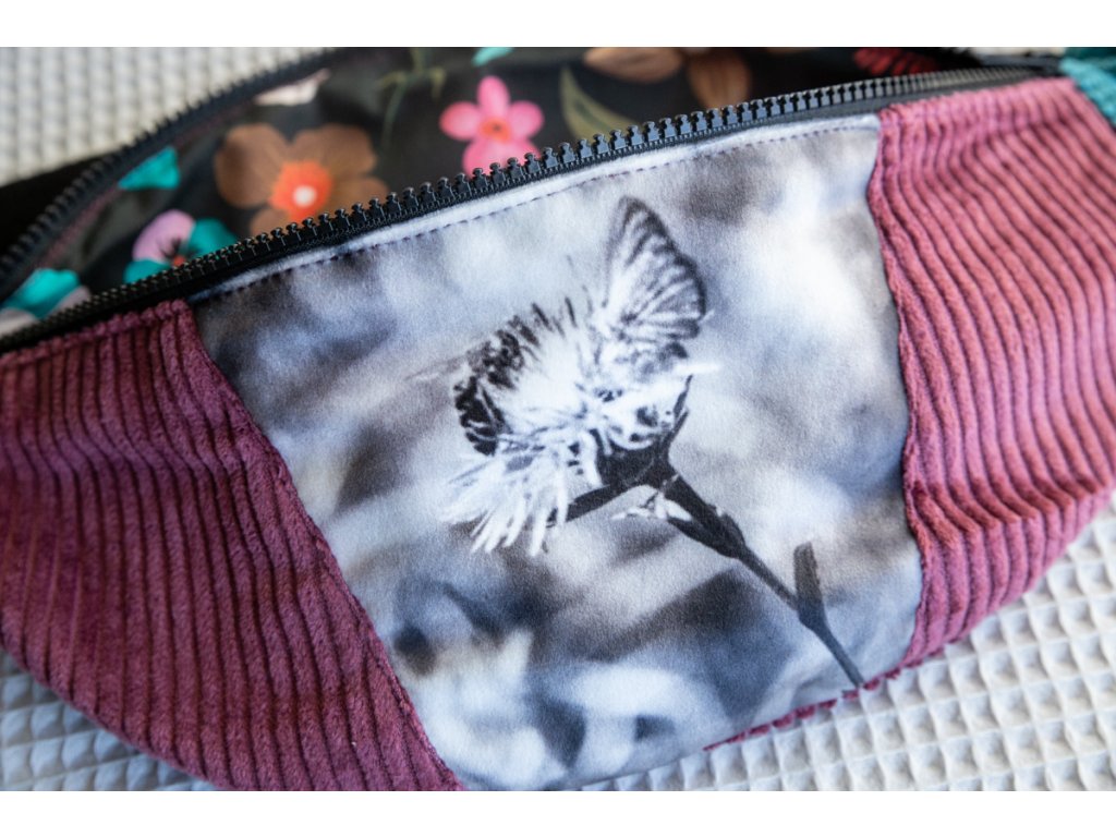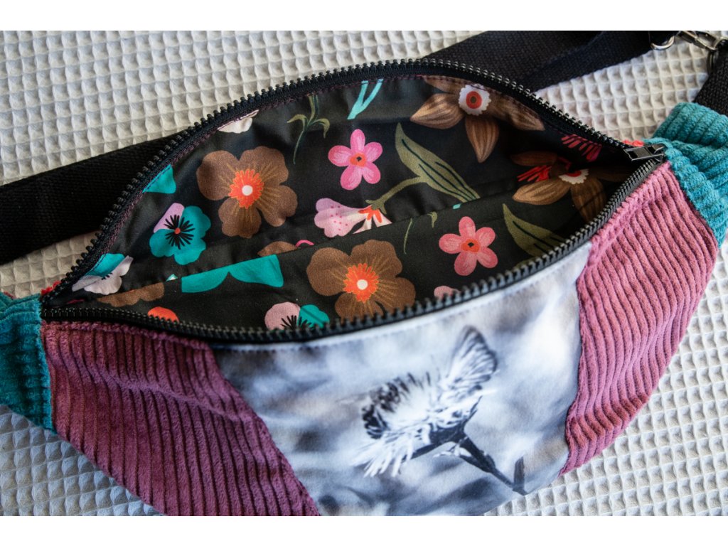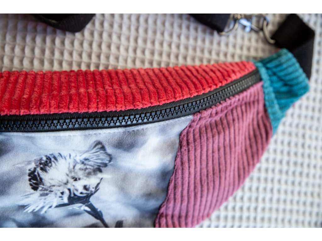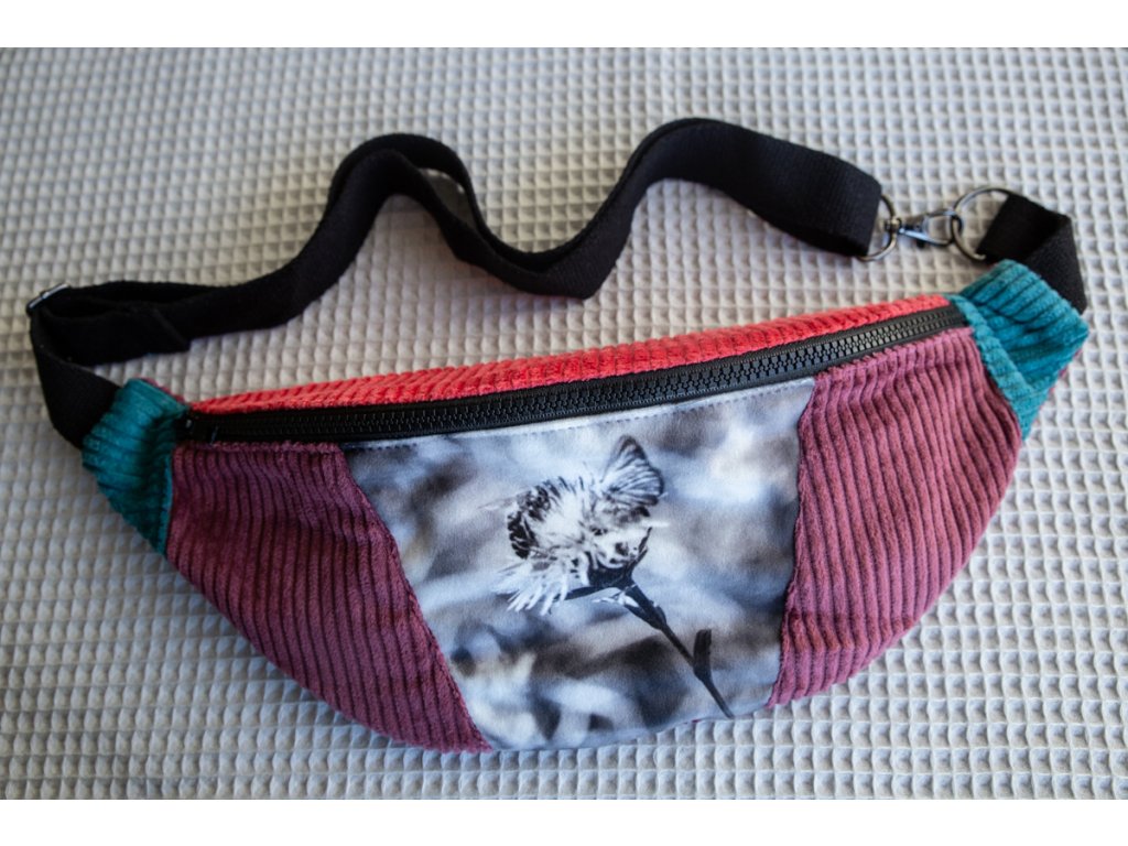 Crossbody ledvinka z manšestru s autorskou fotografií na plyši. Ruce máš volné, všechno důležité na dosah.