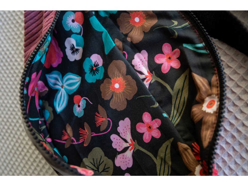 Kombinace měkkého manšestru, plyše s fotografií a pevné bavlněné podšívky uvnitř. Kvalitní zip, nastavitelný bavlněný popruh o šířce 3 cm s kovovými prvky a karabinou.
