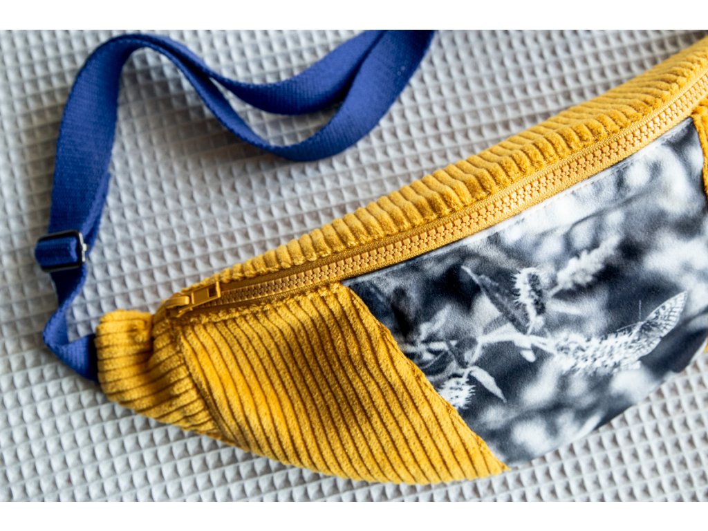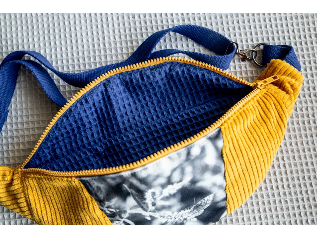 Ledvinka má jednu základní kapsu zavíratelnou na zip. Je ušita z vnější strany z manšestru a plyšové látky s potiskem autorské fotografie a uvnitř se skrývá bavlněná látka s vaflovou vazbou. Bavlněný popruh o šířce 3cm je nastavitelný a doplněný o kovové prvky s karabinou.